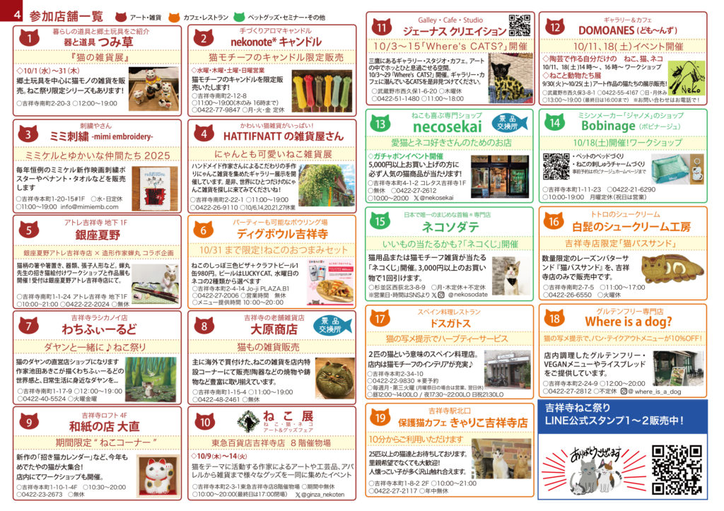 お知らせ 吉祥寺ねこ祭り2025参加店舗 2025年9月26日 necofes 吉祥寺ねこ祭り2025年参加店舗一覧 猫カフェ、猫雑貨のお店、猫アート、様々な「ねこ」を通じて吉祥寺巡りを楽しんでくださいね! 吉祥寺ねこ祭り2025参加店舗 吉祥寺ねこ祭り2025の参加店舗一覧です。 吉祥寺ねこ祭り2025参加店舗